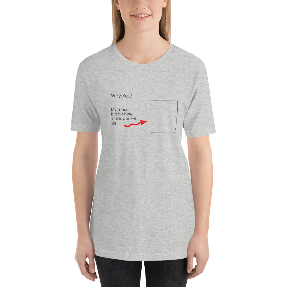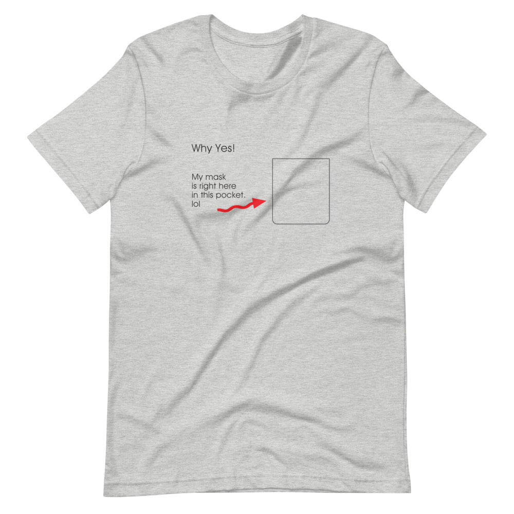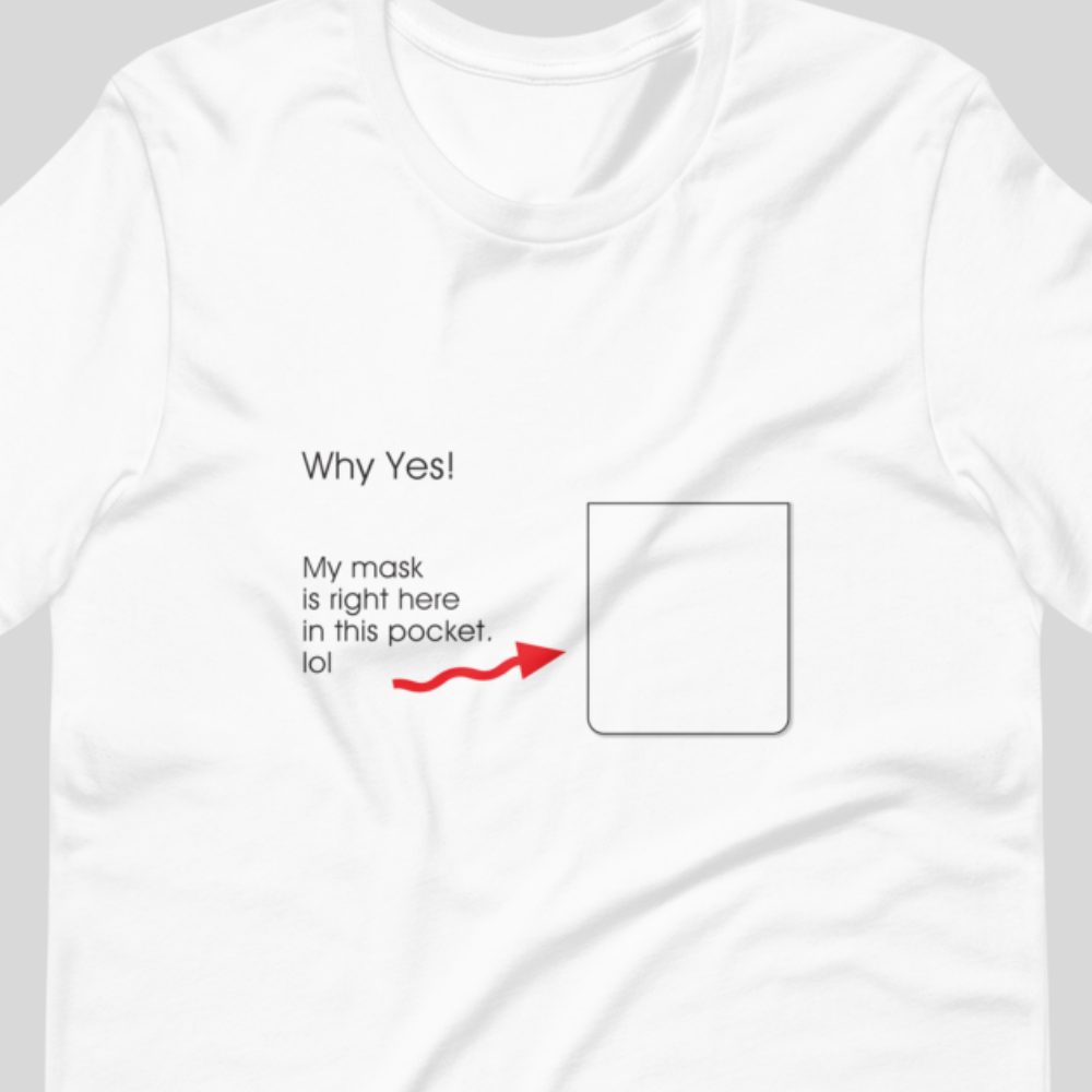 The latest in Covid Wear, this T-Shirt shows you are pandemic-prepared with a mask in your pocket. (Mask and pocket not included.)
